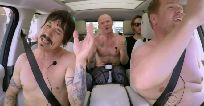 James Corden strips down and has a helluva lot of fun in a new “Carpool Karaoke” with the Red Hot Chili Peppers
