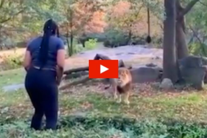 • Woman Jumps into Cage for Bold Standoff with Lion