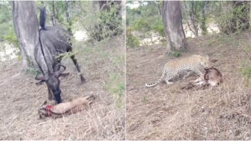 • A chance encounter with a leopard ended in disaster for a wildebeest and her calf