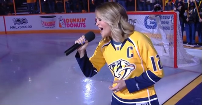 • Carrie Underwood surprises crowd with national anthem performance at Mike Fisher’s hockey game