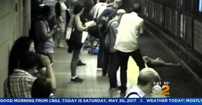 • With a train only a minute away, a woman frighteningly collapsed and fell on the tracks