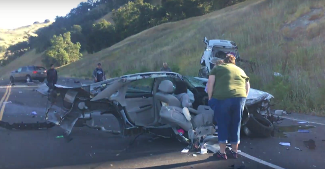 An SUV tore off half of this car in a freak accident that an ex-ambulance driver said was the craziest thing he’d ever seen
