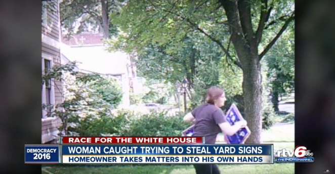 A woman stealing a Trump sign hit a bit of a wall mid-theft, and the homeowner caught the whole thing