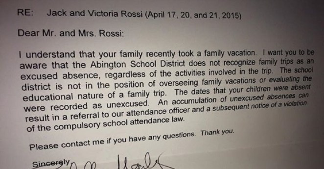 A father got a note from a principal for taking his kids on vacation and totally schooled her with his response