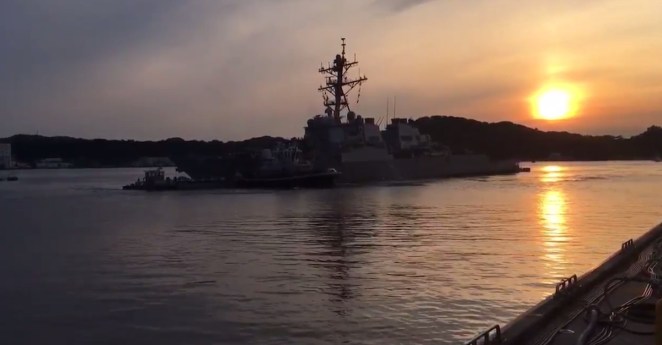 A Navy destroyer has hit into a 29,060-ton container ship, and a frantic search for seven sailors is underway