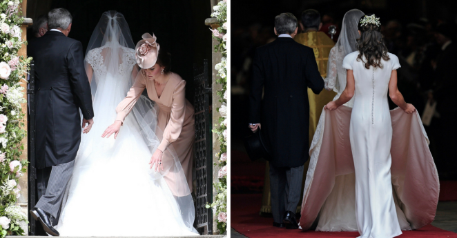 Duchess Kate returns the favor by holding sister Pippa’s train as she prepared to walk down the aisle