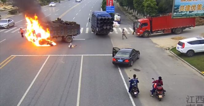 Insane video shows a motorcyclist crash into a truck’s fuel tank, catch on fire and live to tell the tale